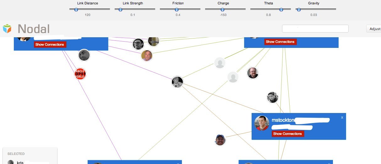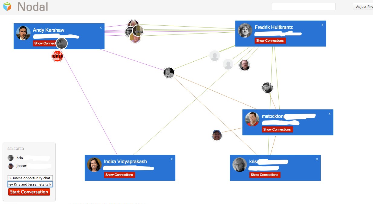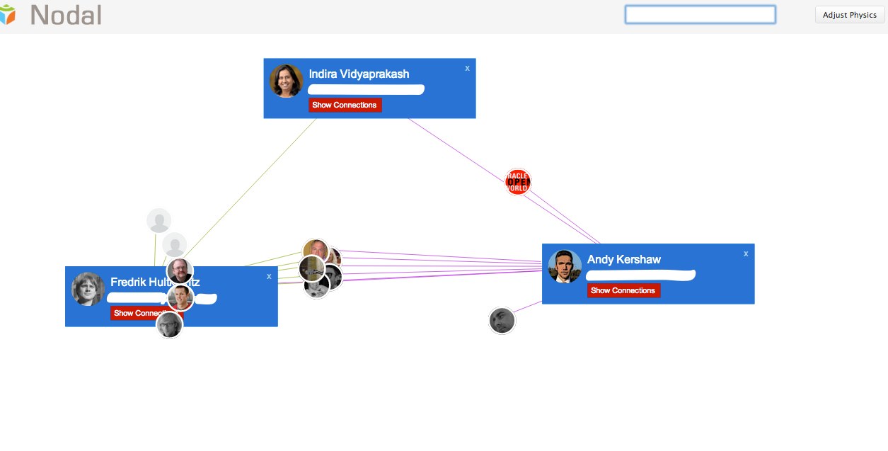 The guys from HarQen built Nodal to provide a visual way to navigate your connections and conversations in Oracle Social Network and view relationships. Using Nodal, you can: