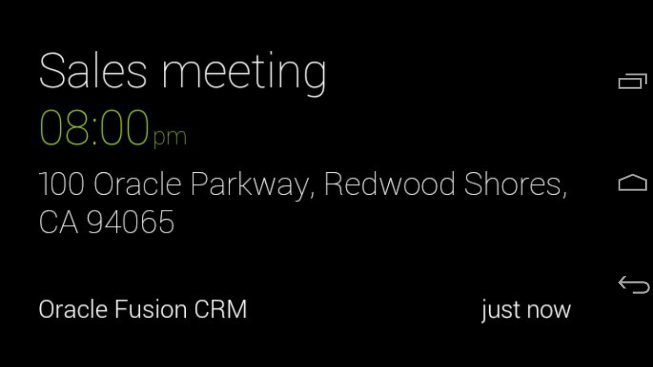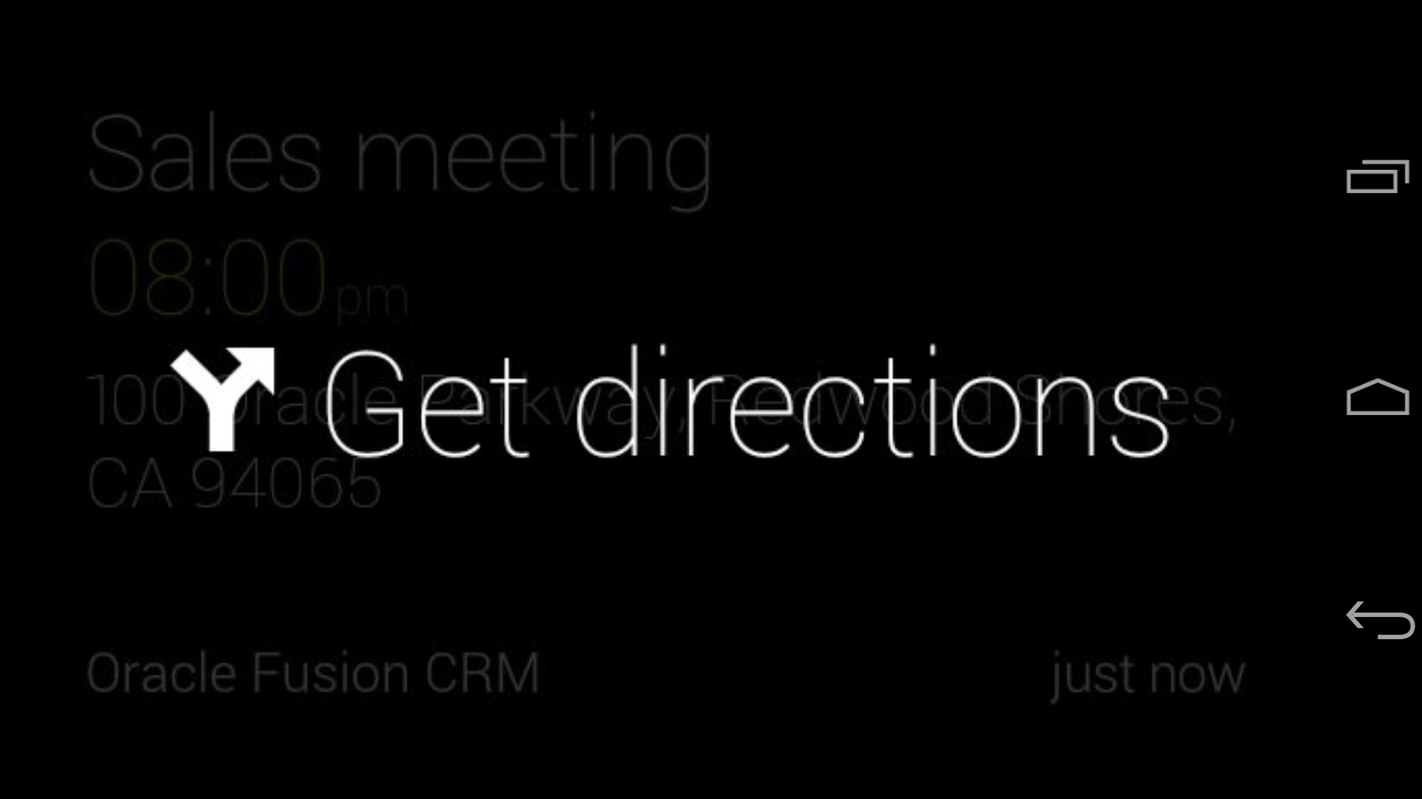 During the meeting, she can dictate notes with Glass to capture action items or to-dos, and take pictures of the white board or hand-written notes which she can share with her sales team on G+ and upload to Fusion CRM to attach to the customer record or an opportunity.