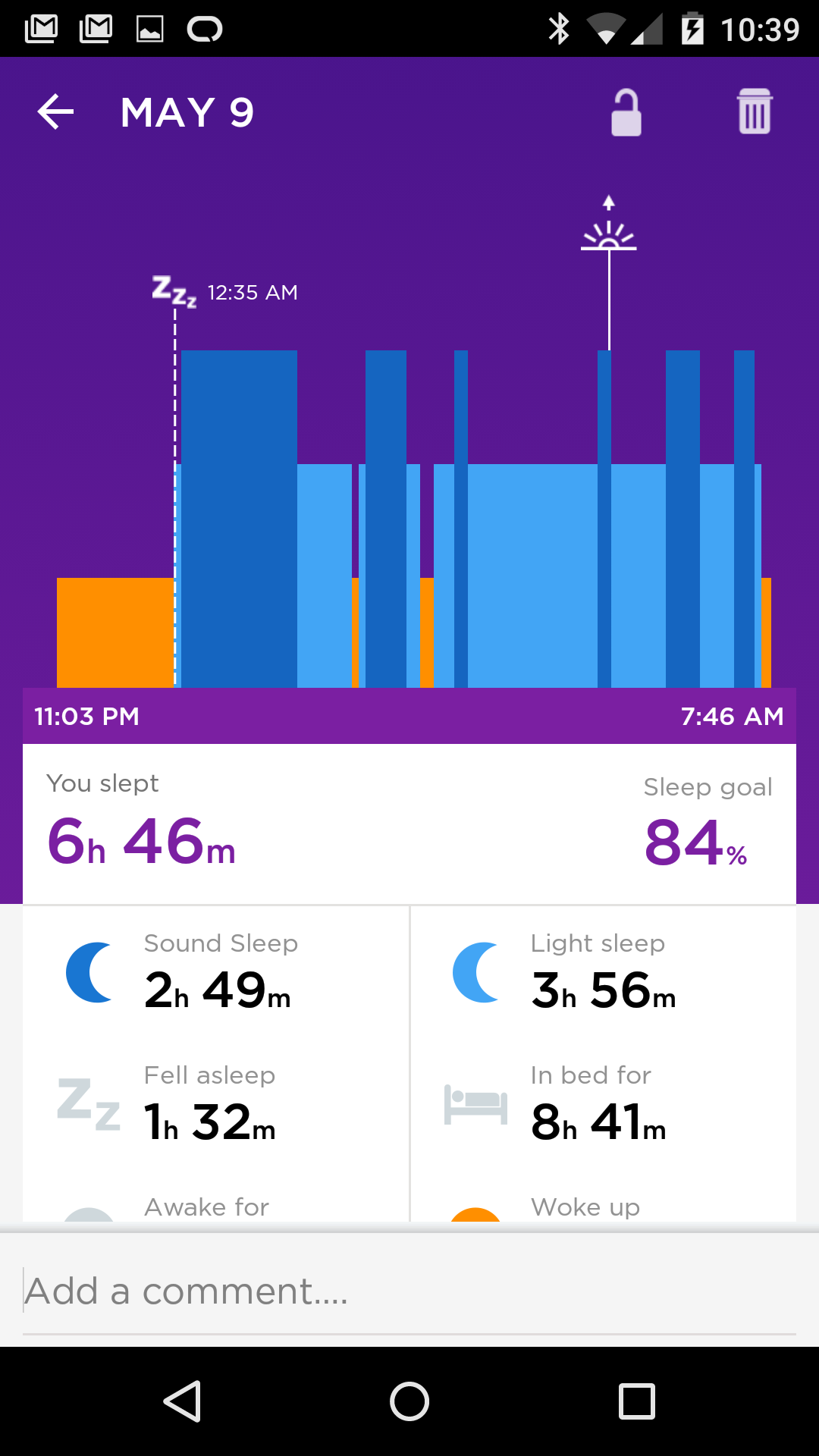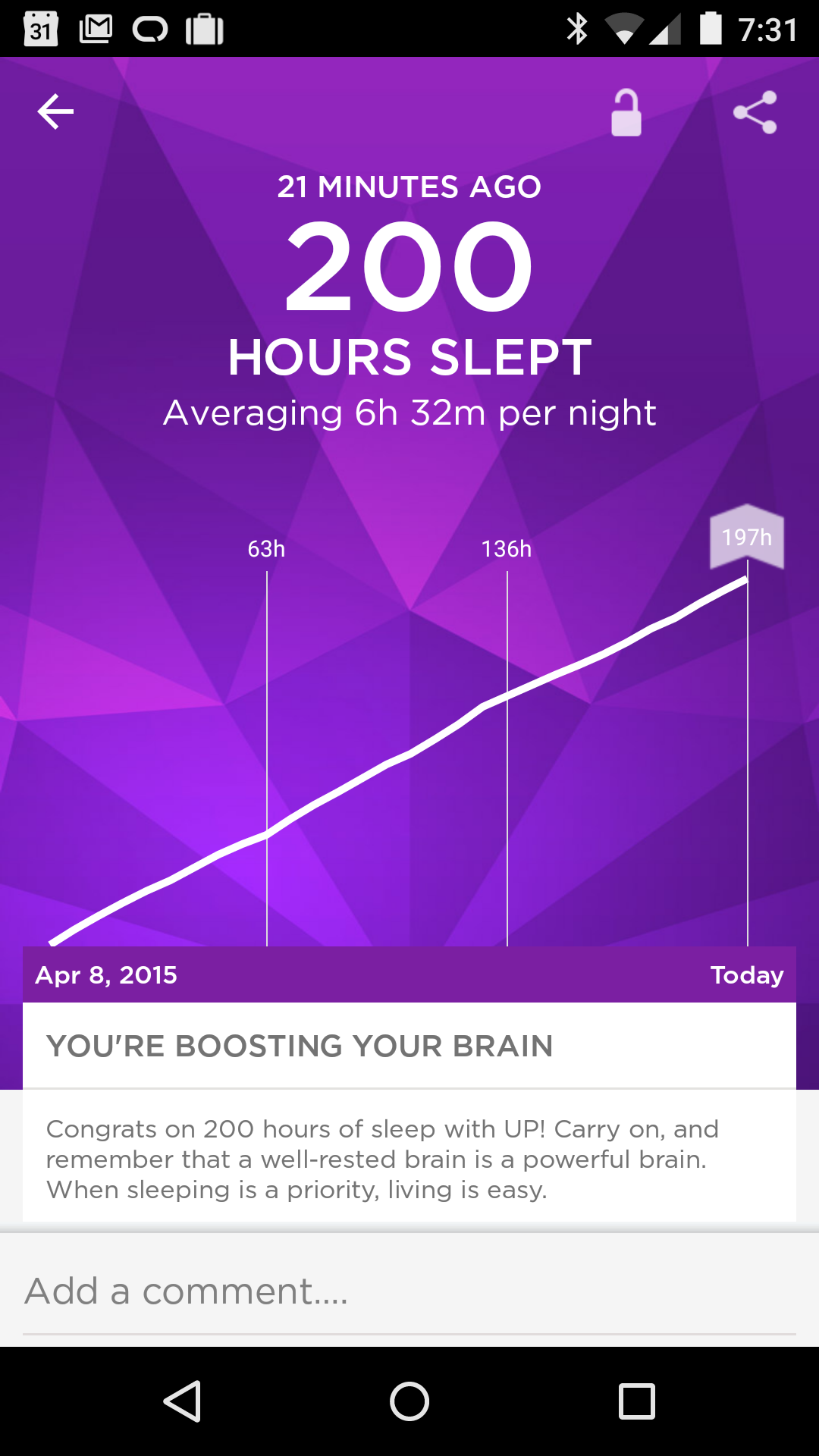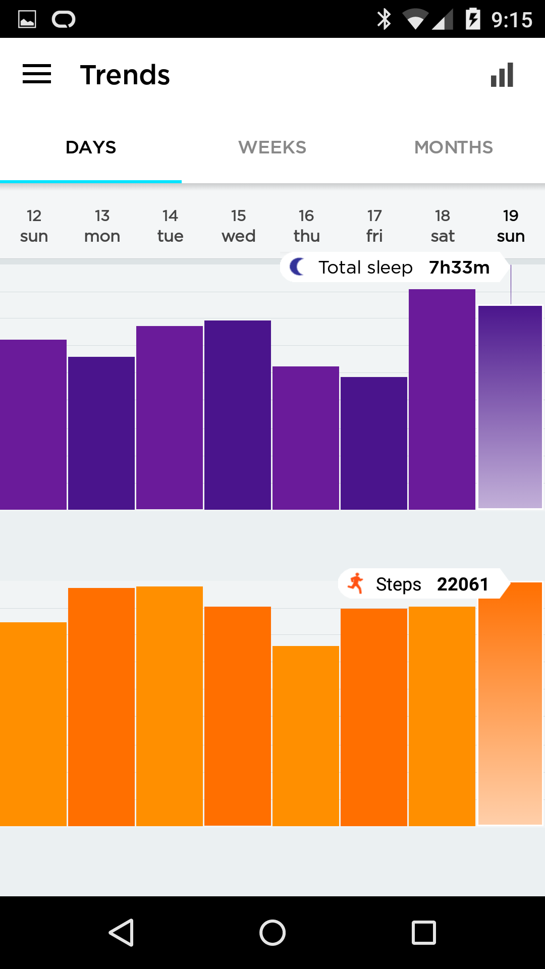 The stream is easily understood at a glance, so kudos to the UX. Orange shows activity, purple sleep. There are other things you can add, weight, mood, etc. I did those for a few days, but that didn’t last, too lazy.