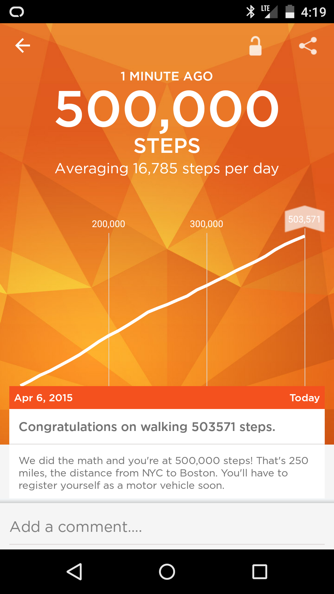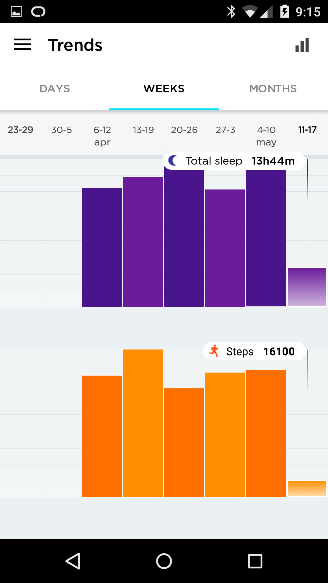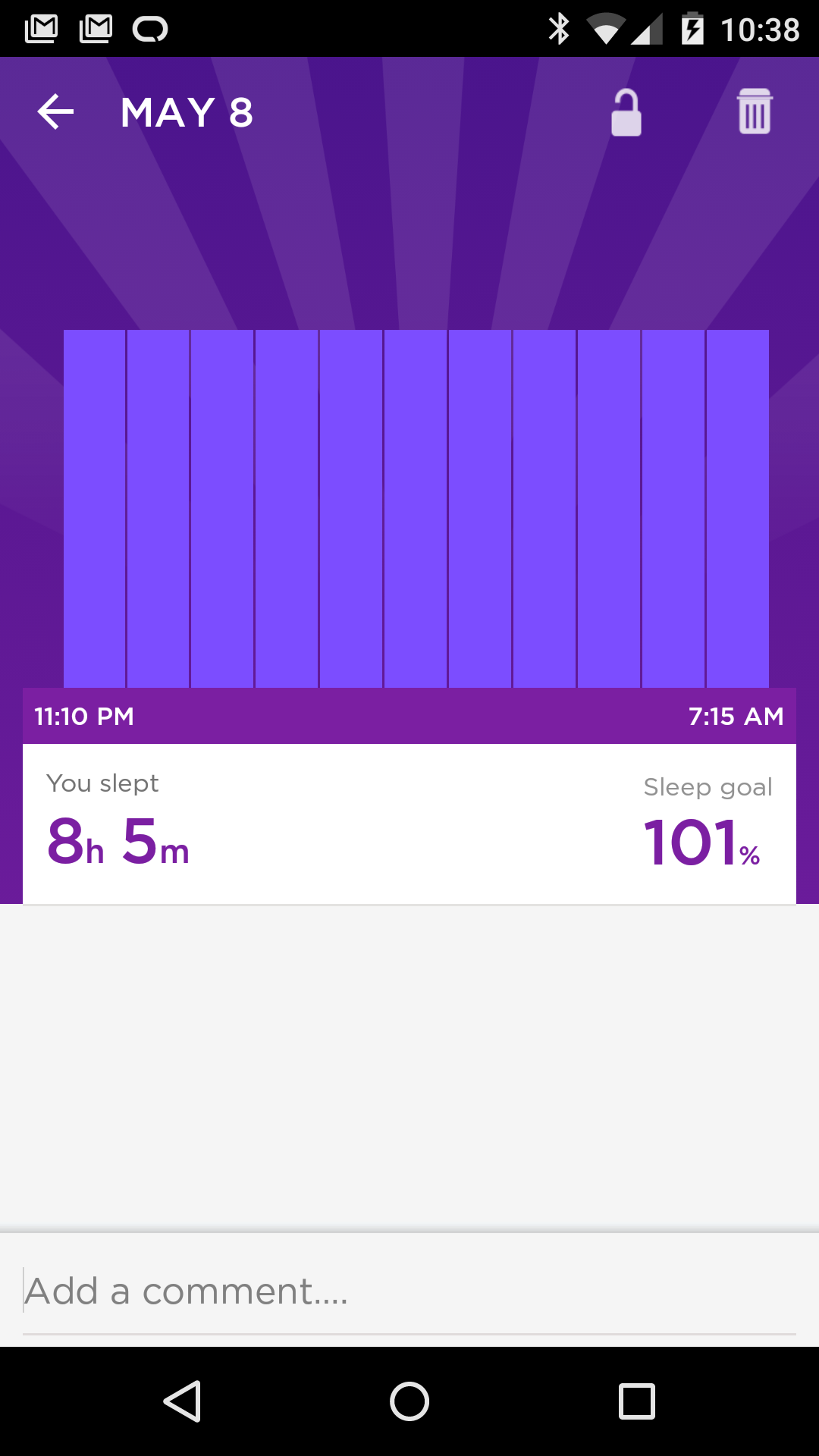 The stream is easily understood at a glance, so kudos to the UX. Orange shows activity, purple sleep. There are other things you can add, weight, mood, etc. I did those for a few days, but that didn’t last, too lazy.