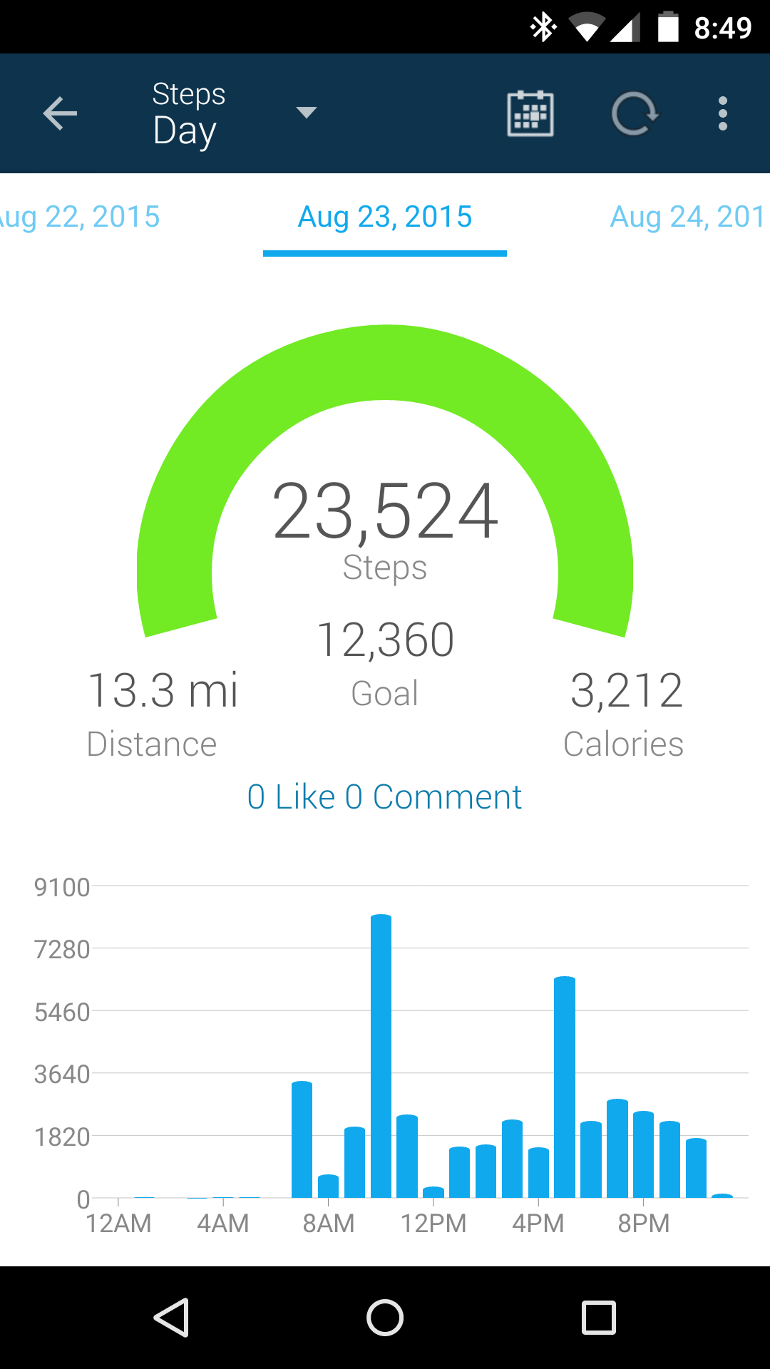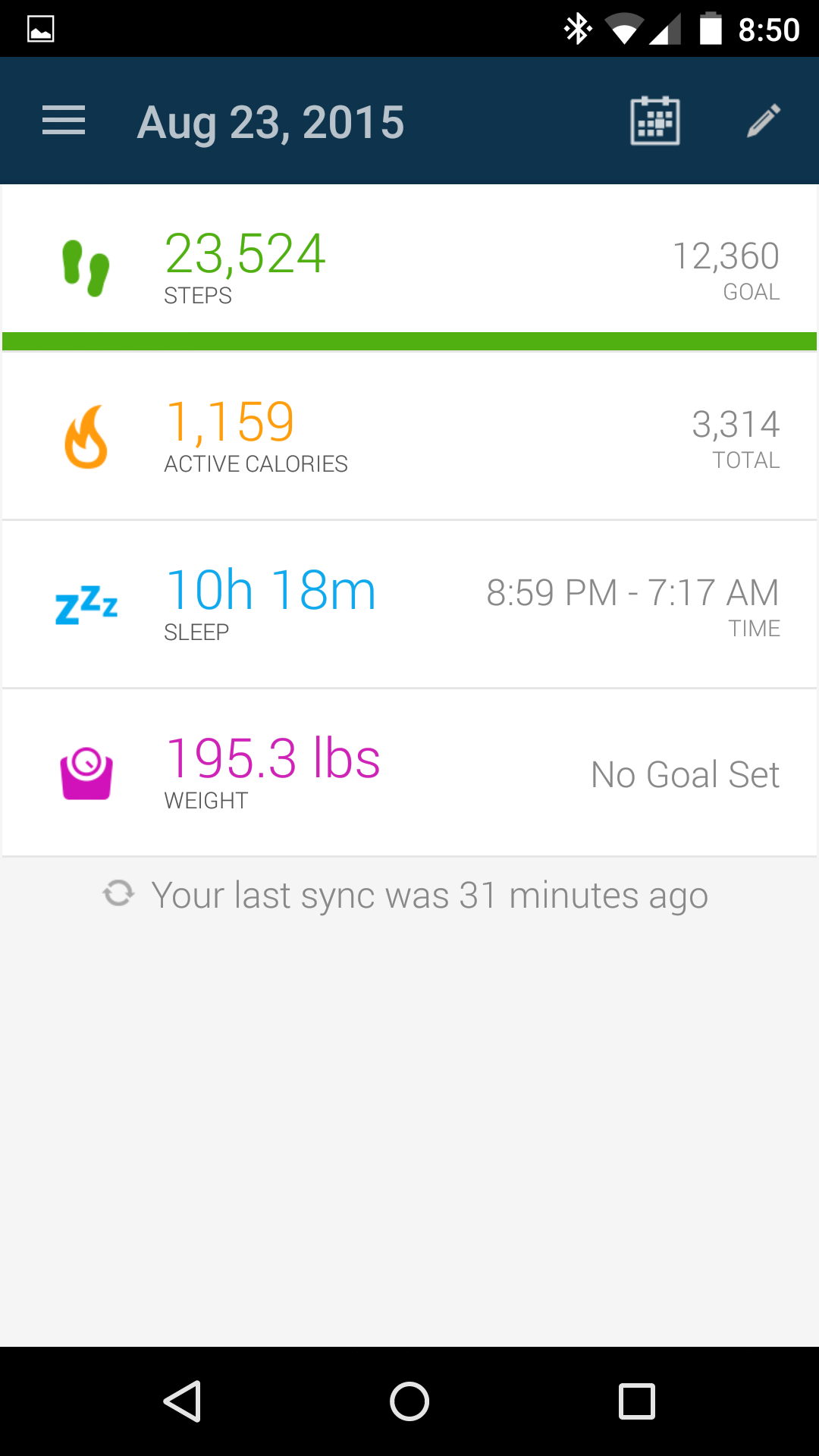 One feature I don’t recall seeing anywhere else is the automatic goal setting for steps which increases incrementally as you meet your daily goal. The starting default was 7,500 steps, and each day, the goal rose a little, I assume based on how much I had surpassed it the previous day. It topped out at 13,610.